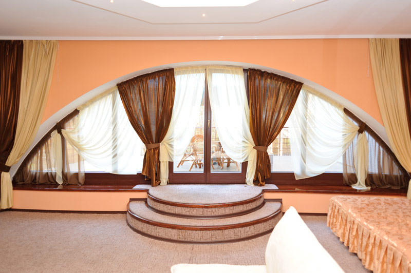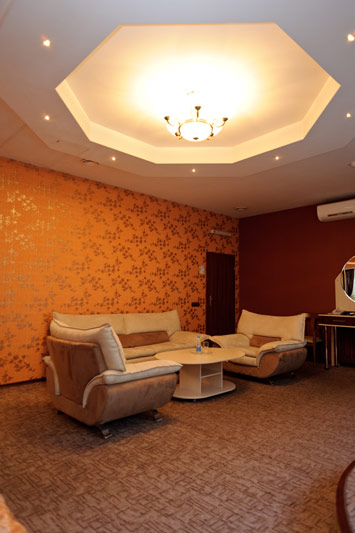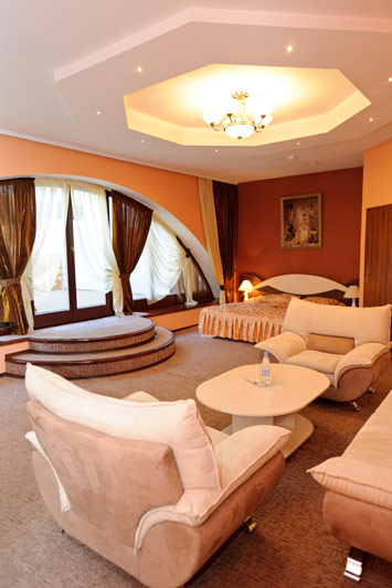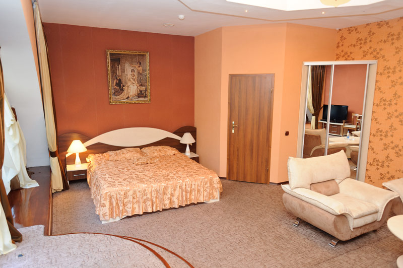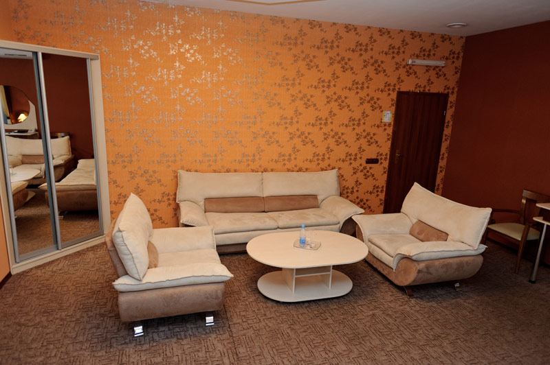 Окрім двоспального ліжка, у номері класу напівлюкс є м’який куточок на два спальних місця. Номер укомплектовано платяною шафою, кондиціонером та окремим санузлом. Гостям готелю надається уся необхідна техніка, включаючи міський телефон та плазмовий телевізор зі супутниковим телебаченням. У ванній кімнаті ви знайдете свіжий комплект махрових рушників, фен, капці та всю необхідну міні-парфумерію. Гостям номера класу «Напівлюкс» відкритий доступ до цілодобового ресторанного обслуговування.