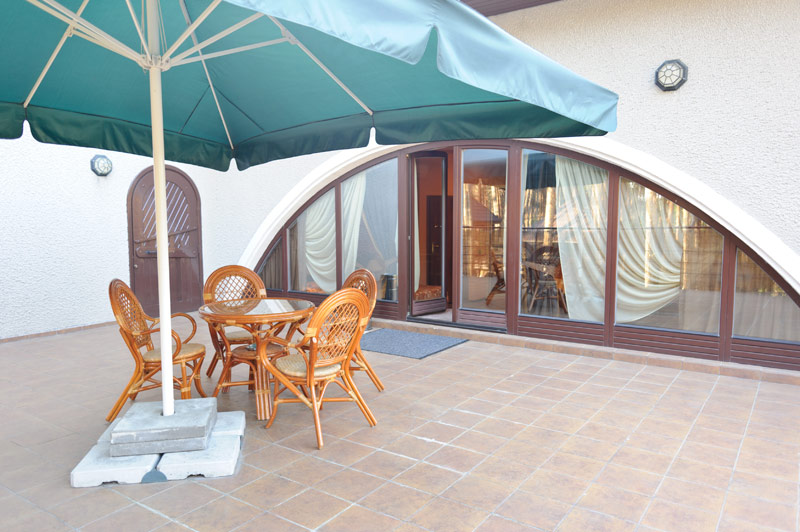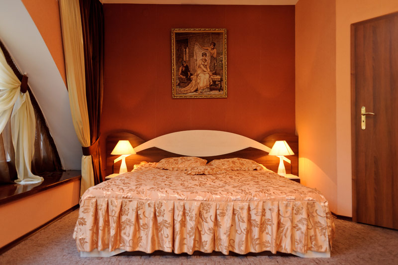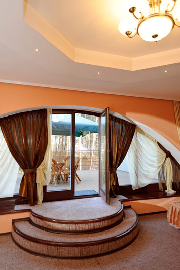 Номер класу «Напівлюкс», №10 (кімната в основній будівлі)Ще один комфортабельний номер розташований в основній будівлі ресторанно-готельного комплекса «Мухомор», що відкриває максимально зручний доступ до всіх розваг, розташованих всього одним поверхом нижче. Крім того, у розпорядженні гостей знаходиться велика тераса з літніми меблями, що дозволяє чудово провести святкування будь-якої події у дружній компанії або просто добре відпочити у Полтаві. На терасі обладнане місце для паління.