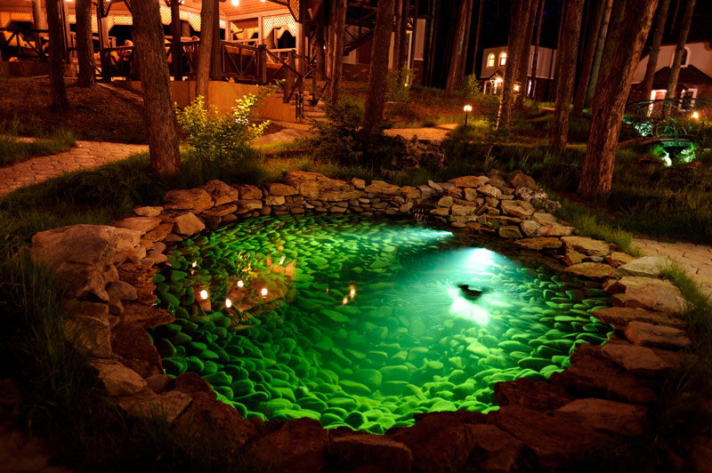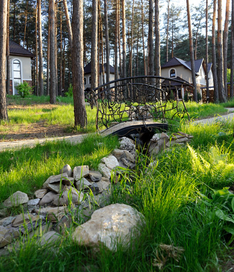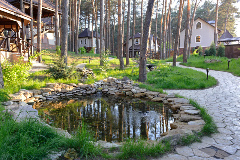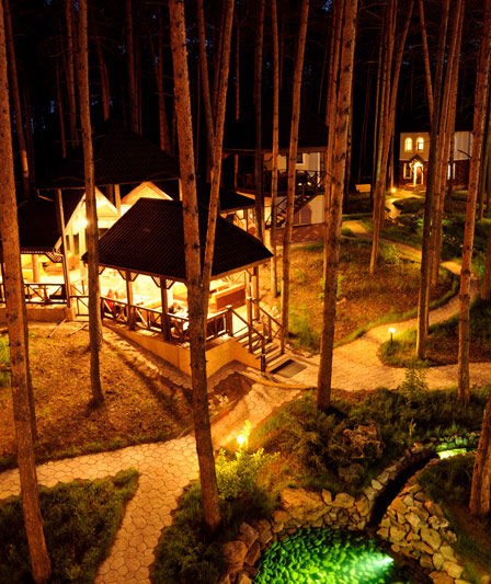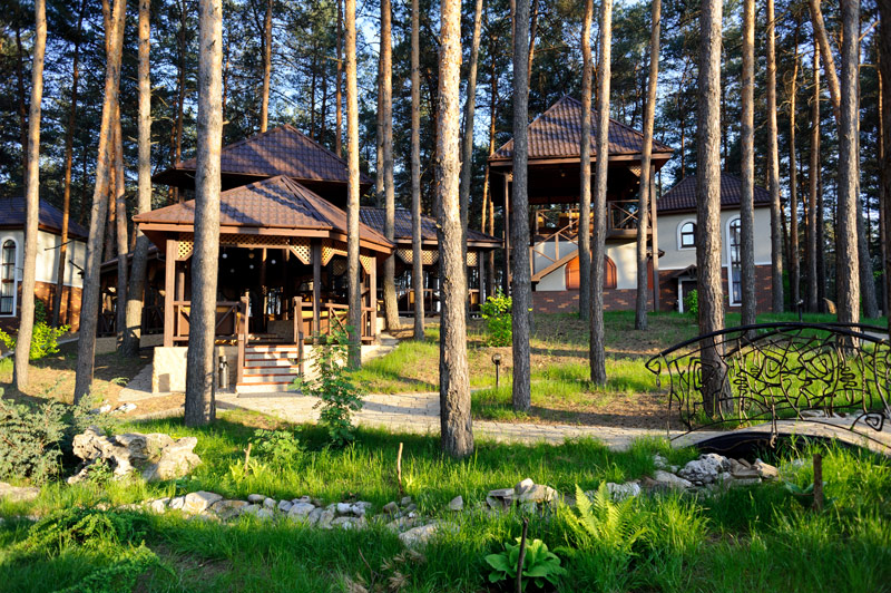 Оригінальний багатоярусний літній майданчик ресторана приносить особливе задоволення любителям відпочинку на свіжому лісовому повітрі. Затишок соснової галявини доповнений спеціально облаштованою унікальною ландшафтною композицією зі ставками та струмочком. Хвойний запах високих сосен, дзюрчання струмка, дерев’яні бесідки, м’який диванчик та звуки природи – що може бути краще у погожий теплий день?