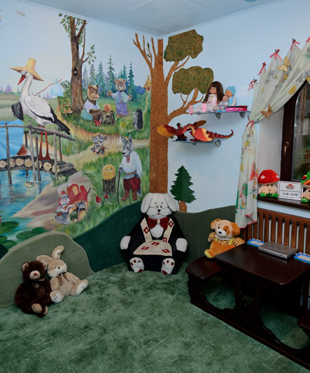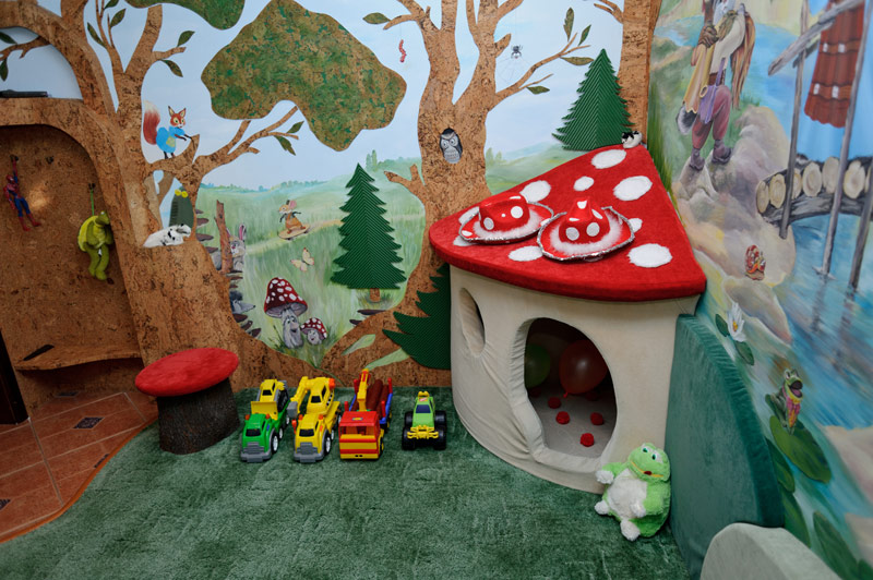 Створюючи різноманітні розваги для відпочинку дорослих, ми не забули і про дітей. Затишна і тепла розписна ігрова кімната готелю стане справжнім спасінням тих, хто подорожує та відпочиває усією сім’єю. Поки ви розслабляєтесь у бані, кальянній, більярдній залі або ресторані, уважні вихователі займуть ваших діточок різноманітними розвиваючими іграми. Попавши у чудову казку, діти попустують від душі!
